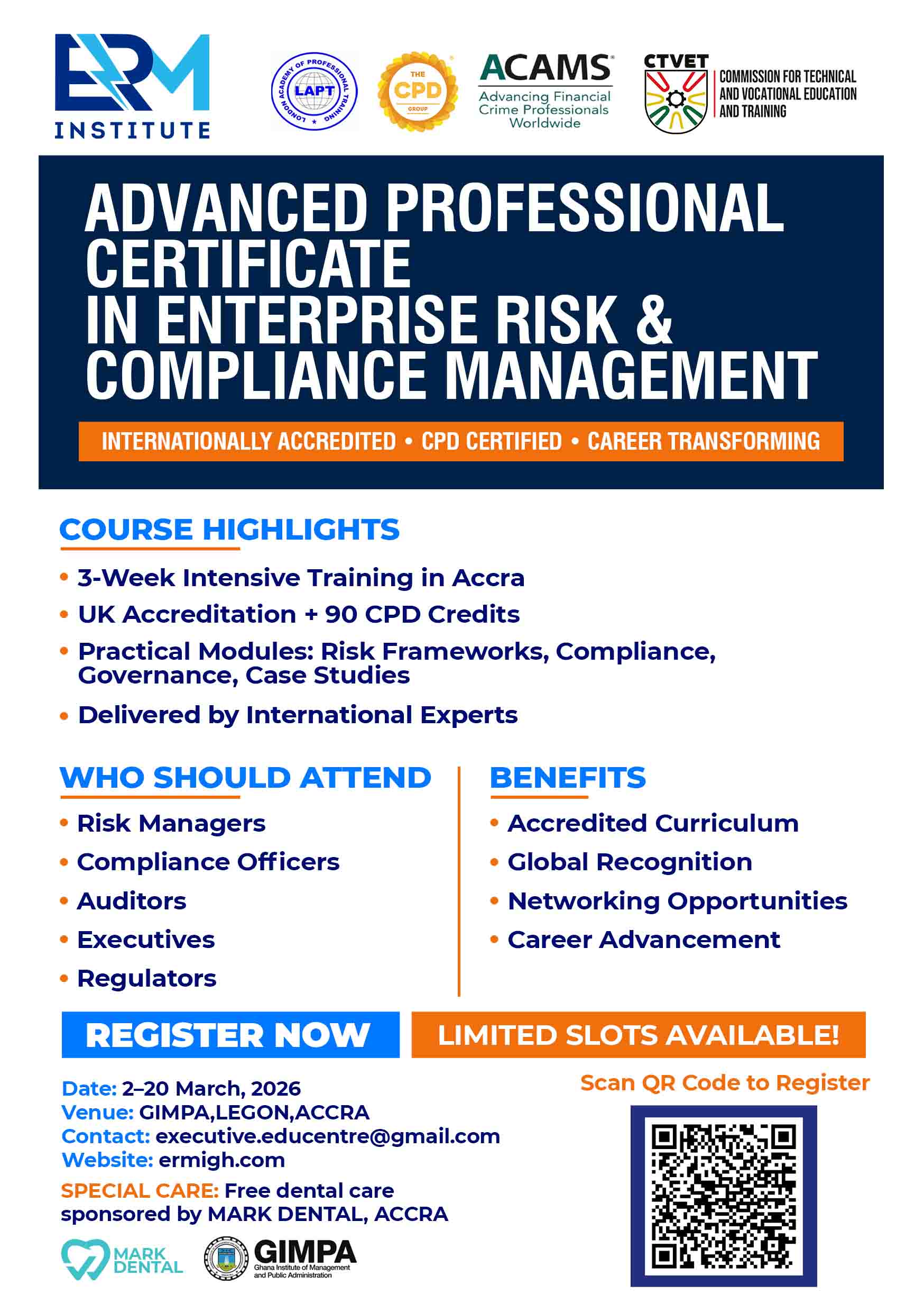 We provide globally recognised qualifications and training, consulting, and set professional standards for certified risk management specialists (CRMS) in Africa. We also have chapters in United Kingdom and Europe that organises events and networking opportunities for members.